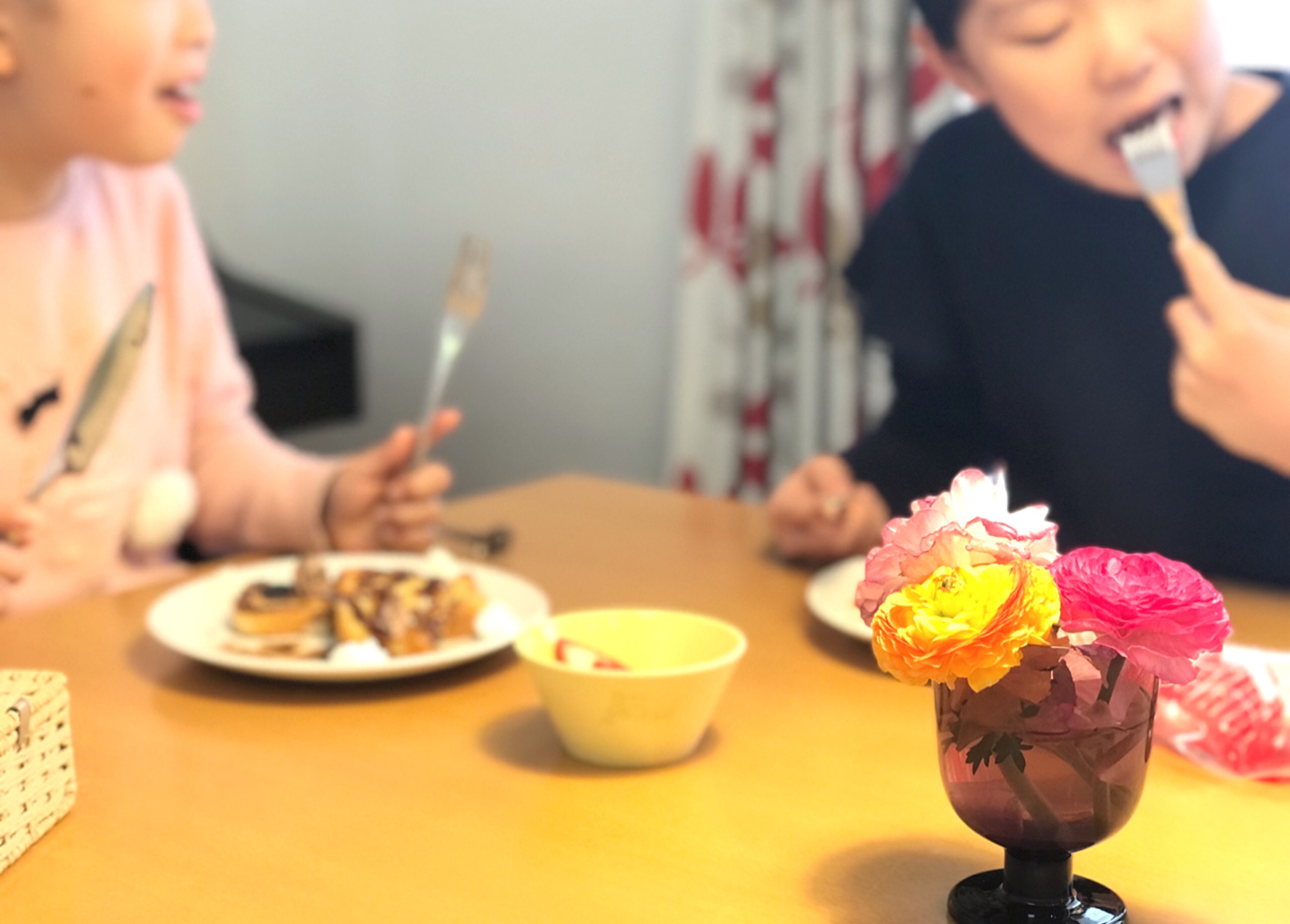 「ラナンキュラス、どの色が好き?」なんて言いながら、あまいあまいフレンチトーストとココア。